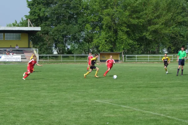 In den ersten Minuten tasteten sich die Mannschaften gegenseitig ab. Dann nahm Kölleda das Ruder in die Hand und netzte durch Theo nach wunderbarer Vorarbeit von Levi zur frühen Führung ein. Vier Minuten später legte Levi erneut für Theo auf. Dieser brachte das Spielgerät souverän im Sömmerdaer Kasten unter. Unsere Gäste taten sich gegen die sicher stehende FSV-Abwehr schwer. Mit schönen Kombinationen kam Kölleda zu guten Möglichkeiten weiter zu erhöhen. In der 18. Minute landete der Eckball von Timi auf dem Fuß von Colin. Dieser zog von 16 Metern ab und jagte den Ball sehenswert in den Winkel. Mit einer komfortablen 3:0 Führung ging es in die Kabinen. Es wurde daran erinnert, dass die Partie noch nicht zu Ende ist. Es musste weiter konzentriert gespielt und in der Defensive Fehler vermieden werden. Dies setzte die Mannschaft nach Wiederanpfiff um. Zwar bäumte sich Sömmerda bis zur 30. Minute noch mal auf und hatte ihrerseits Möglichkeiten zu verkürzen, doch Torwart und Abwehr verhinderten dies. Nach guter Vorarbeit von Ben konnte erneut Theo als sicherer Vollstrecker zum 4:0 erhöhen. Dann flachte die Partie etwas ab. Zehn Minuten vor Schluss allerdings zog der FSV 06 das Tempo nochmal an und kam über Theo in der 46. und Ben in der 48. Minute zur endgültigen Entscheidung.