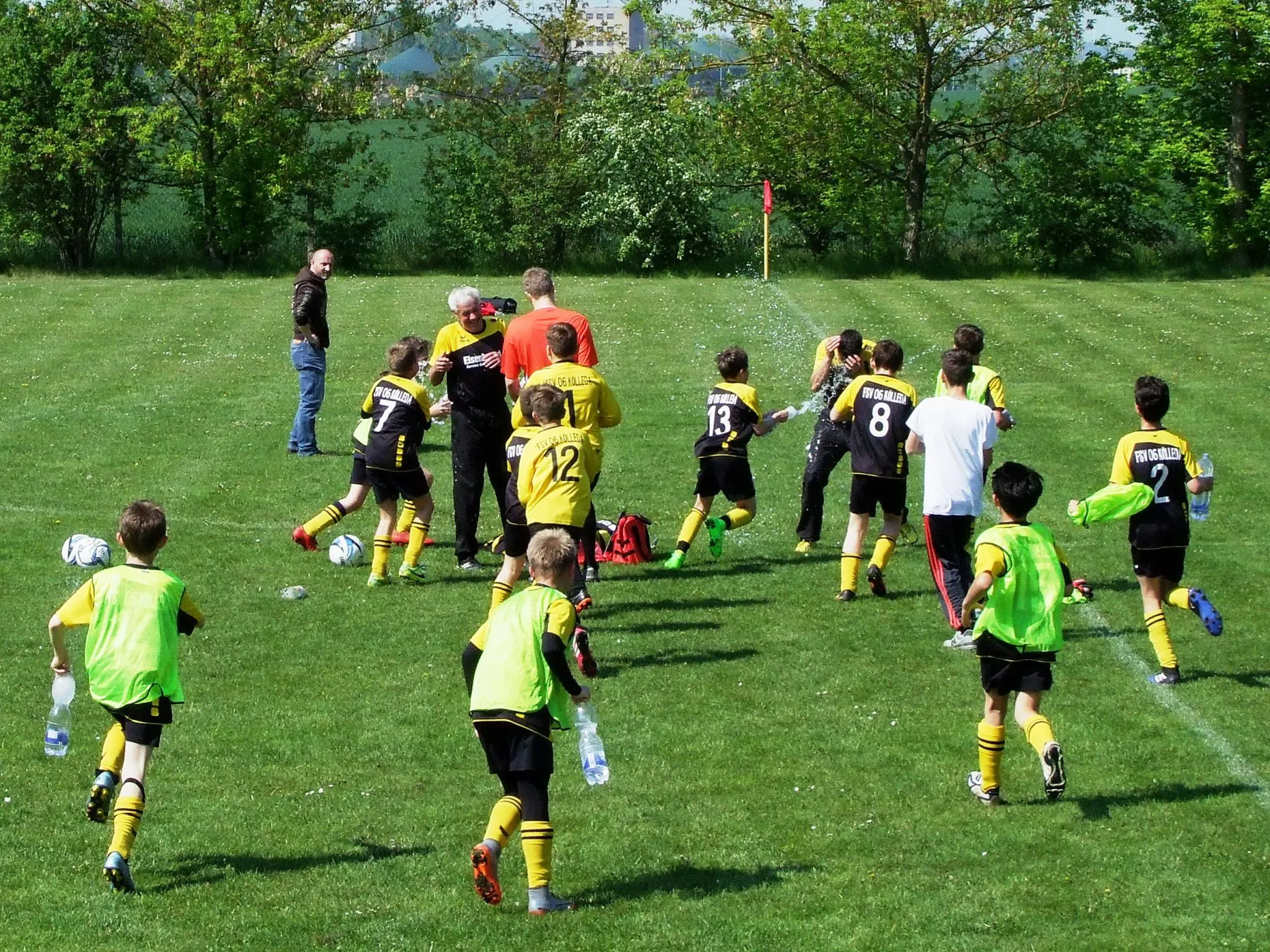 Bereits in der ersten Minute netzte Henne nach klasse Vorarbeit von Timi zur frühen Führung ein. Sieben Minuten später war es Julian, der sich den Ball im Erfurter Spielaufbau erkämpfte und zum 2:0 einschoss. Im Laufe der ersten Hälfte erarbeitete sich Kölleda weitere gute Torchancen, welche aber nicht verwertet werden konnten. Erst in der 28. Minute erhöhte Jonas und Timi eine Minute später jeweils per Weitschuss zur beruhigenden 4:0 Halbzeitführung. Für den zweiten Durchgang nahmen wir einige Wechsel vor und sahen nach dem Wiederanpfiff weiter dem wunderbaren Kölledaer Kombinationsfussball zu. In der 35. Minute schoss Johannes nach schöner Einzelaktion zum 5:0 ein. Vier Minuten später bediente Timi mustergültig den einschussbereiten Majed, der das Spielgerät in die Erfurter Maschen beförderte. Den Borntalern gingen langsam die Kräfte aus. Da sie keine Wechseloptionen hatten und teilweise nach Verletzung einige Minuten in Unterzahl spielen mussten, hatte es der FSV einfach und konnte der Partie seinen Stempel aufdrücken. In der 47. und 55. Minute waren es erneut Henne und Johannes, welche zur souveränen 8:0 Führung erhöhen konnten. Dann war Schluss und alle Kölledaer feierten den jetzt auch punktetechnisch erkämpften Gewinn der Meisterschaft.